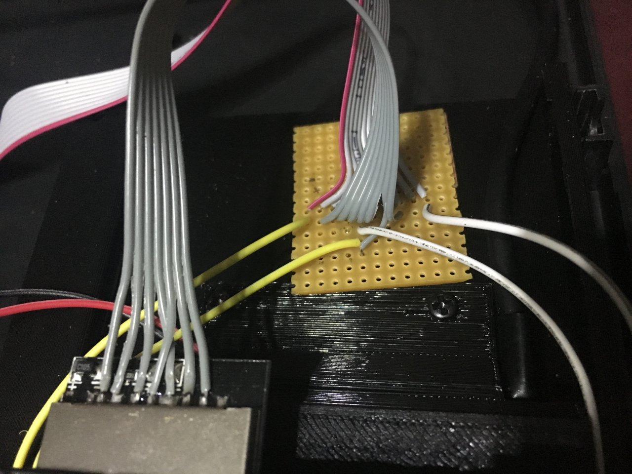 I 3D printed some plastic spacers (6mm tall); the 3D model file is included in the download below called "screw-block", I made 6 of them and glued them to the case where the screw holes lined up on the PCB. Once the glue was set, the PCB could be mounted. Also shown here is the ribbon cable running from the Next daughter-board connector over to the +3 disk drive bay. This cable contains the SD card signals and M1 & Drive button connections. I soldered each connection to a small piece of PCB strip board, which will be used later on: